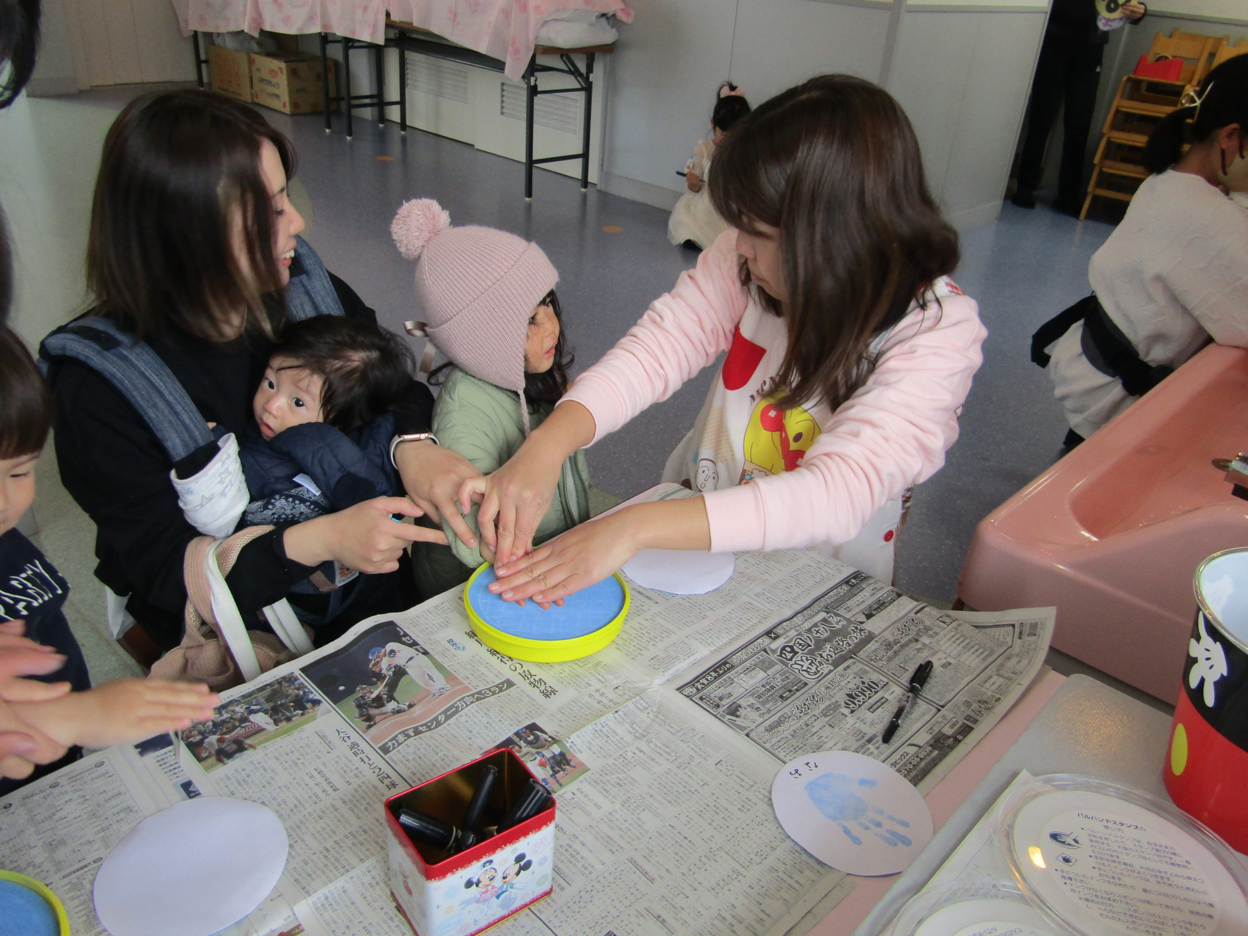 スタンプ台に手を乗せ感触を楽しみながら「手になんかついた」とまじまじ手を見つめる子、嫌‼とびっくりする子様々でしたが