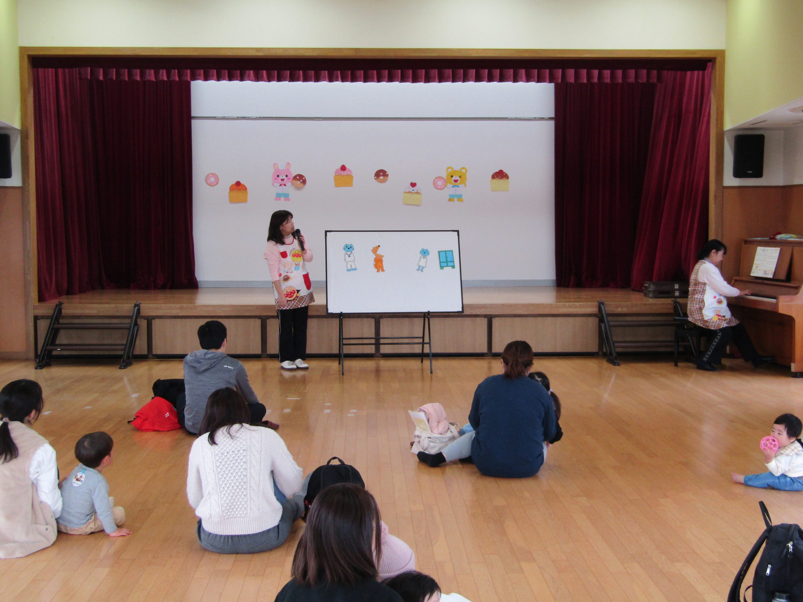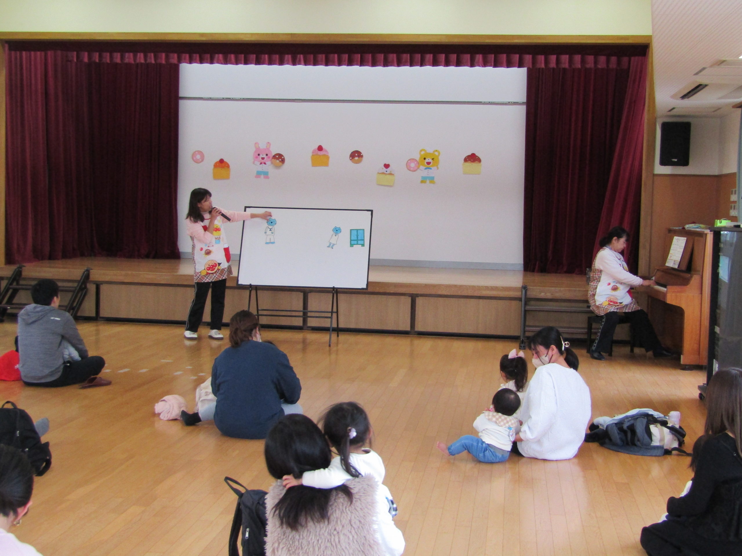 今日のお話は、パネルシアター《ねこのお医者さん》を見ました。歌に合わせニャ―‼と掛け声をして、一緒に楽しみました。