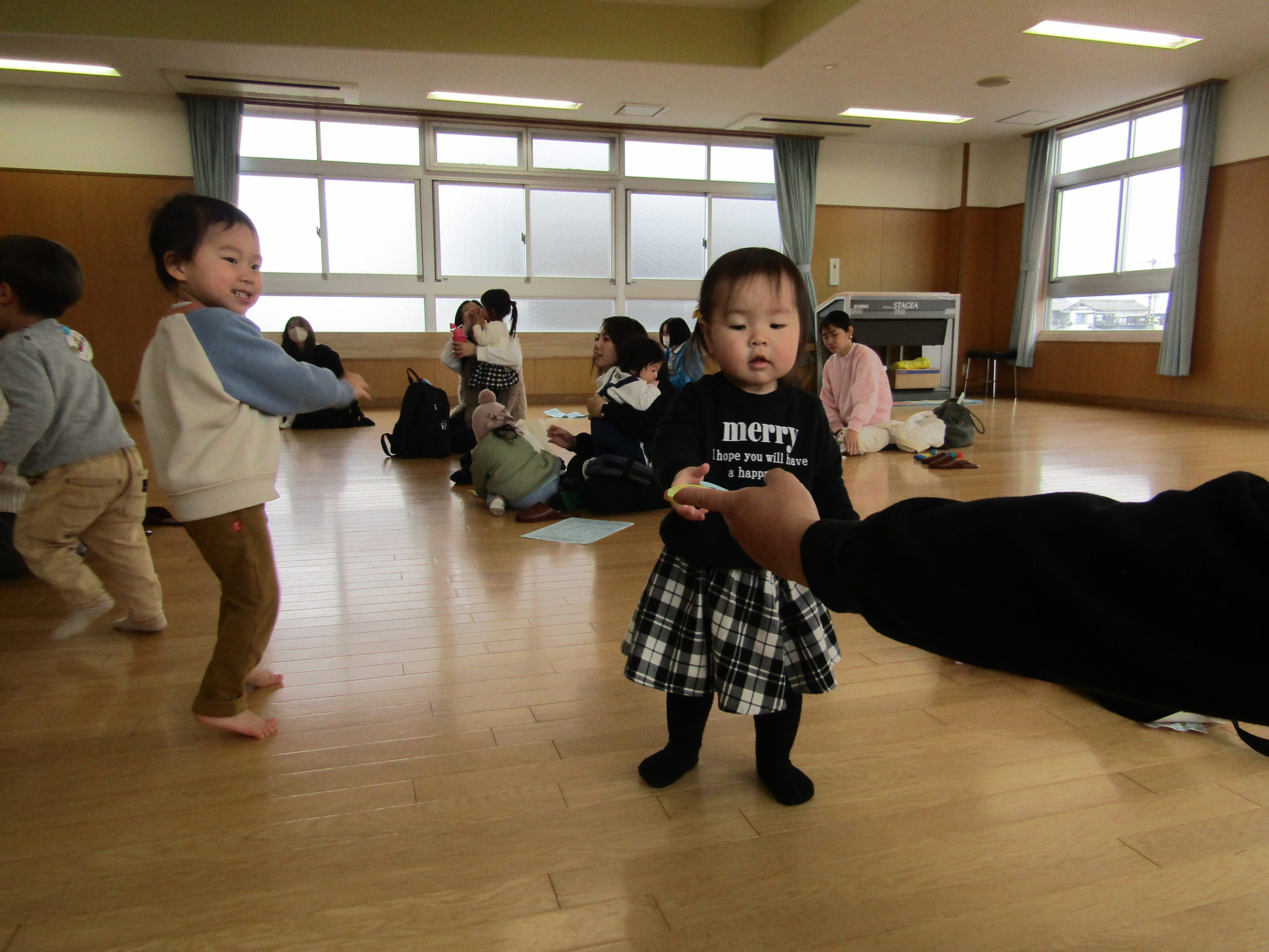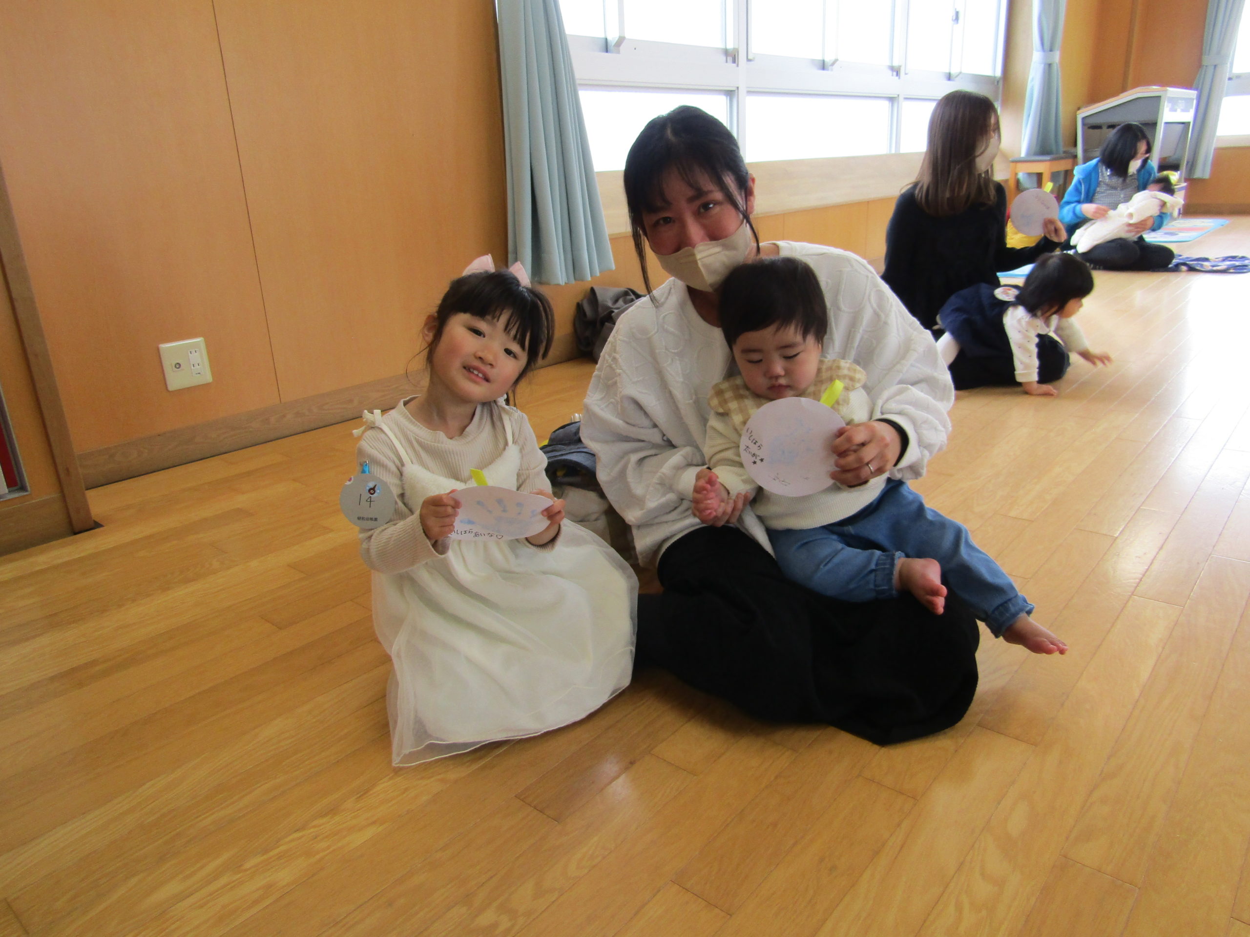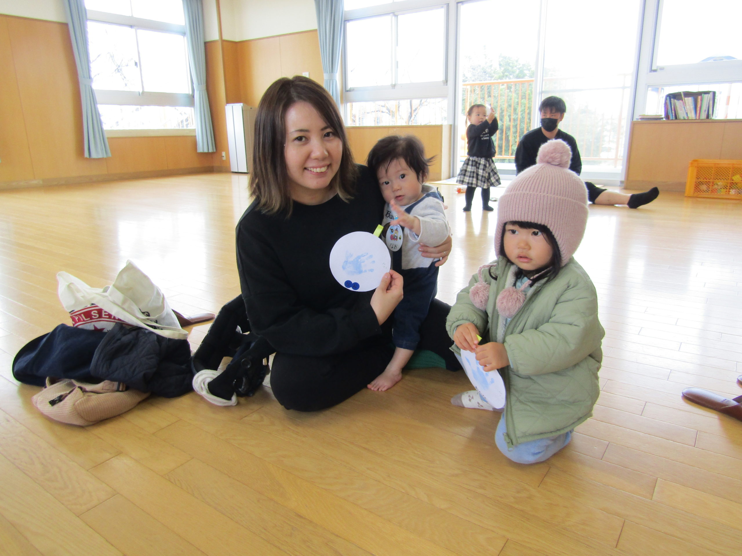 お父さんお母さんが微笑ましく見守って下さり温かい気持ちになりました。お家の方にカードと手形をくっつけてもらい大事そうに持つ姿もとても可愛らしかったです。