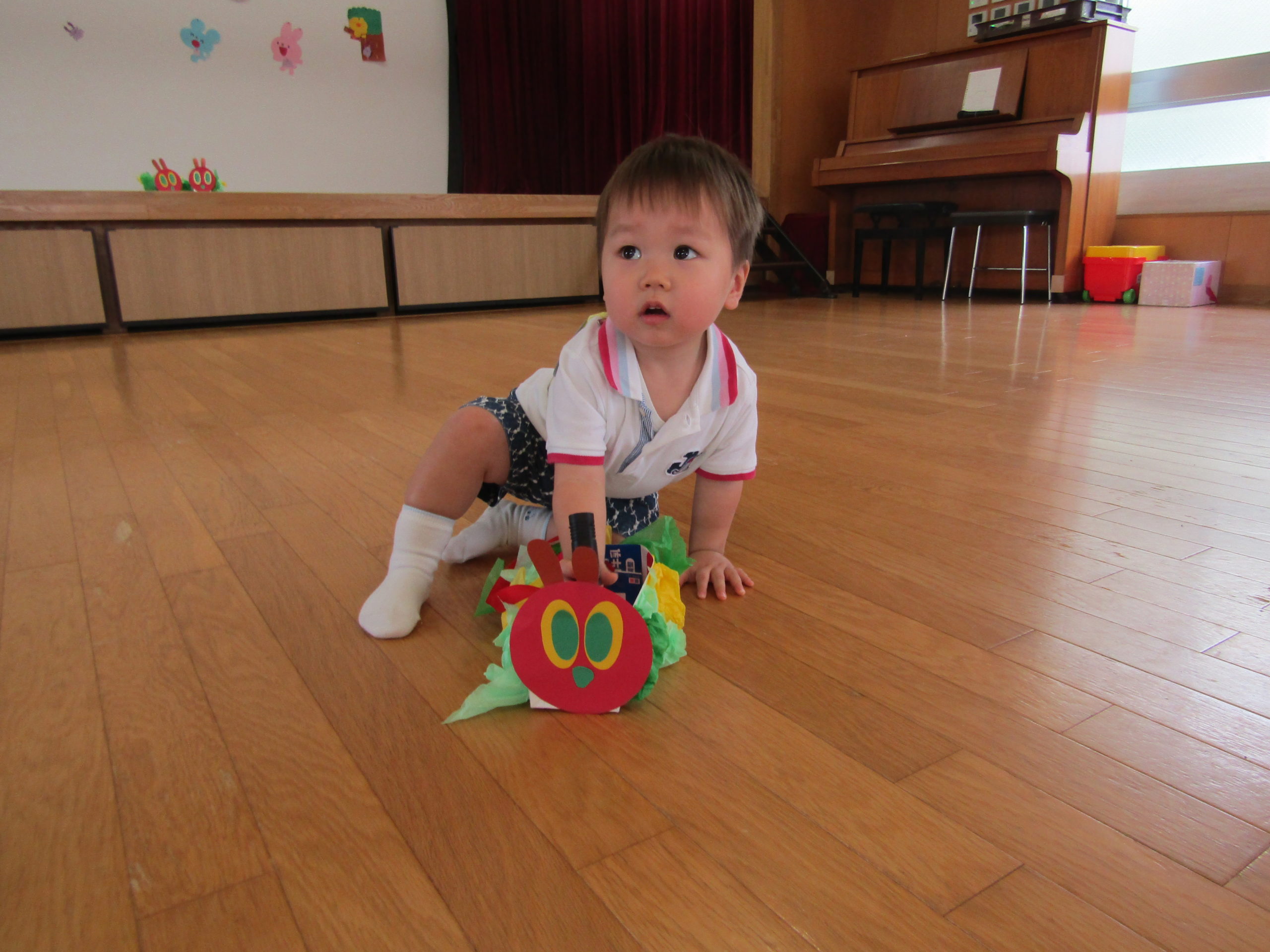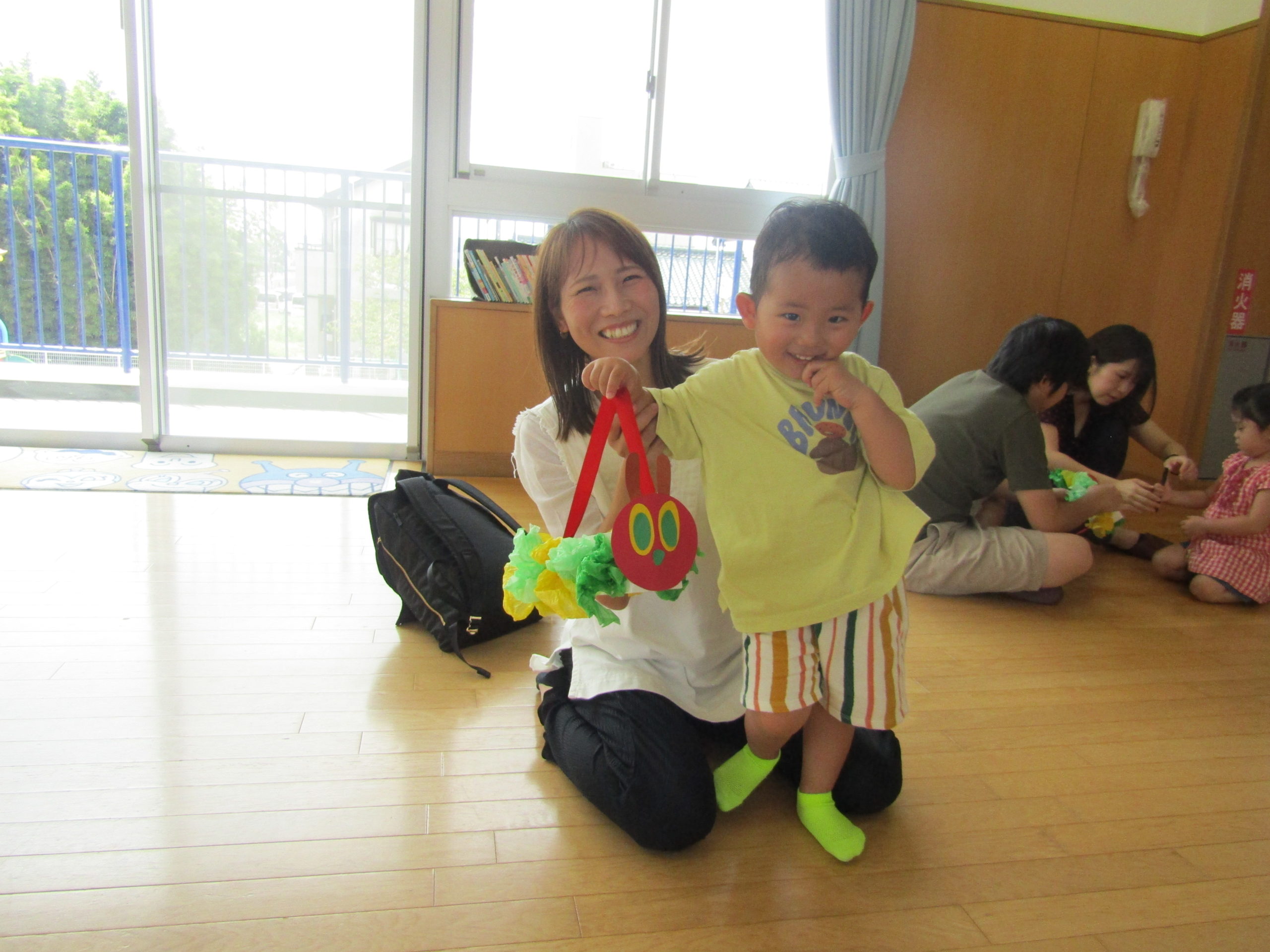 バックの中にあおむしの折り紙を入れてもらうと、みんな笑顔で持ち歩いてくれて