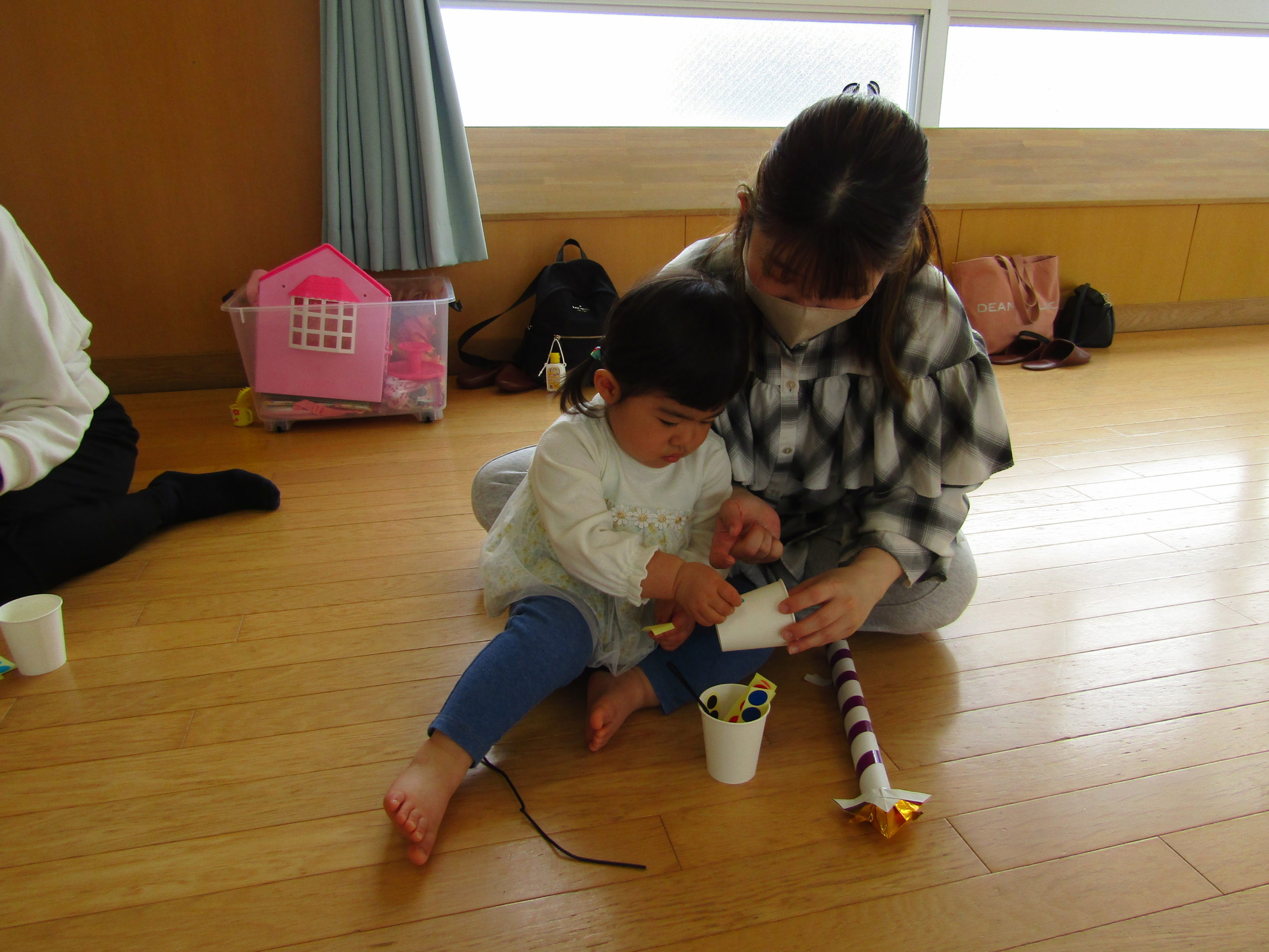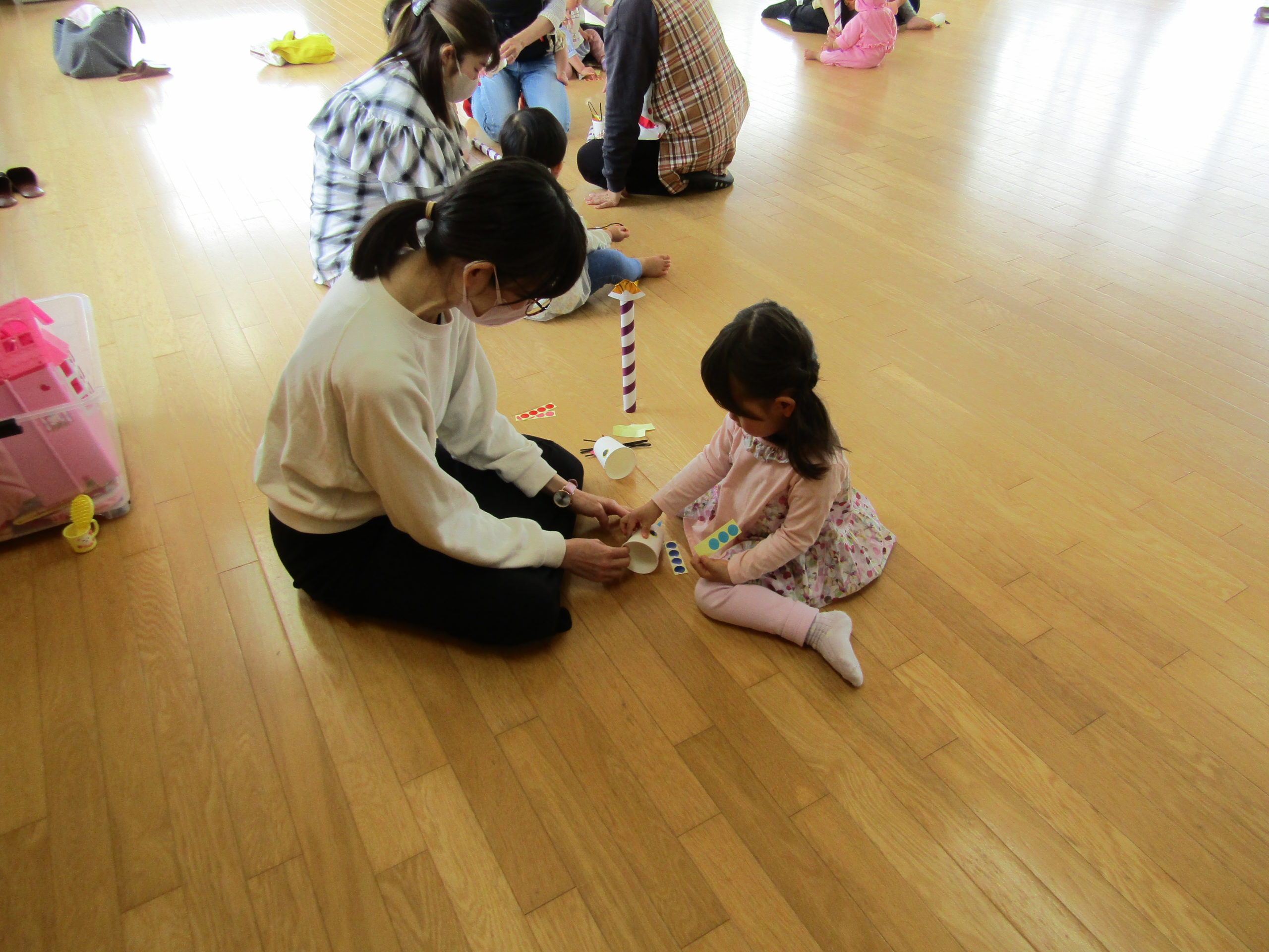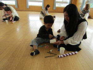 紙コップにシールや尻尾を貼ったり、兜やモールを付けたりとお家の人と一緒に一生懸命取り組んでいました。